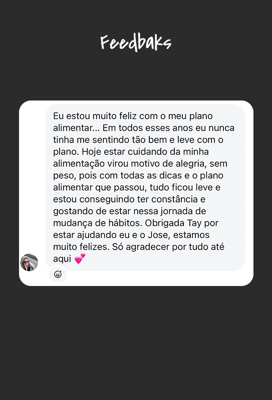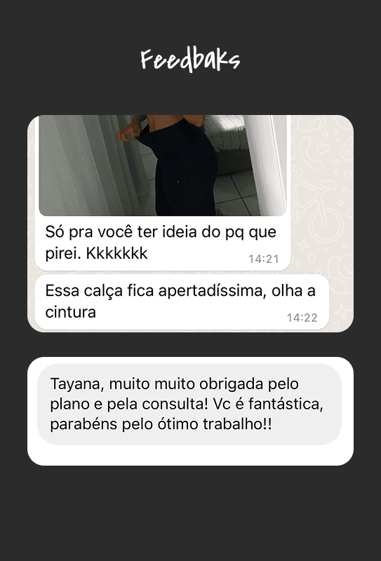 Amei! A Tay é super esclarecedora, monta a dieta de forma prática, dentro da minha realidade, com várias opções de substituição. Além disso, tirou todas as minhas dúvidas pelo WhatsApp. Super indico!
